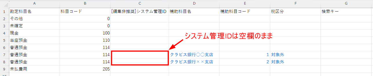テンプレート上のA列(勘定科目名)とC列(システム管理ID)は加筆・修正しないでください。