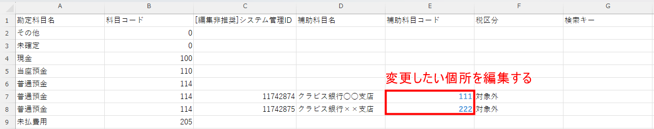 勘定科目・補助科目エクスポートでダウンロードしたCSVファイルを開き、科目情報を編集します。