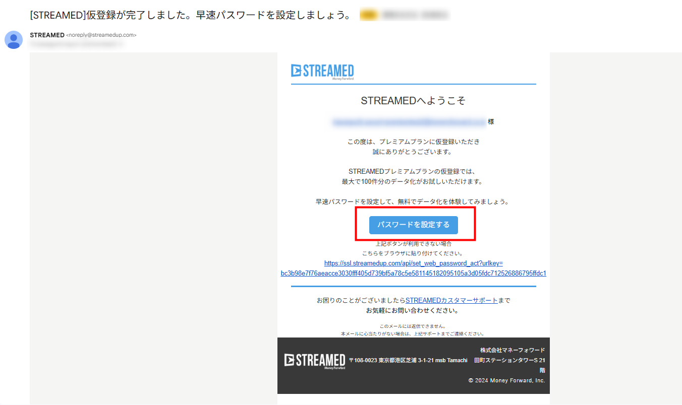 仮登録を行うと、「[STREAMED]仮登録が完了しました。早速パスワードを設定しましょう。」という件名の認証メールが送信されます。