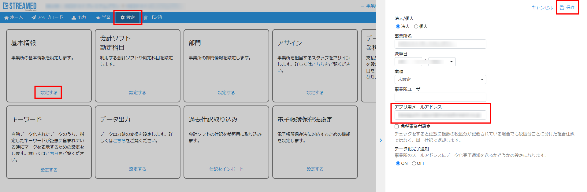 「設定」>「基本情報」の設定画面で「アプリ用メールアドレス」を入力し、右上の「保存」をクリックします。