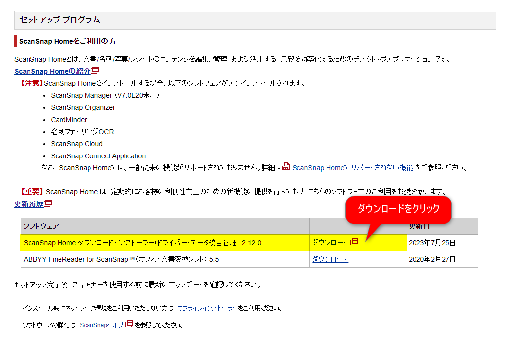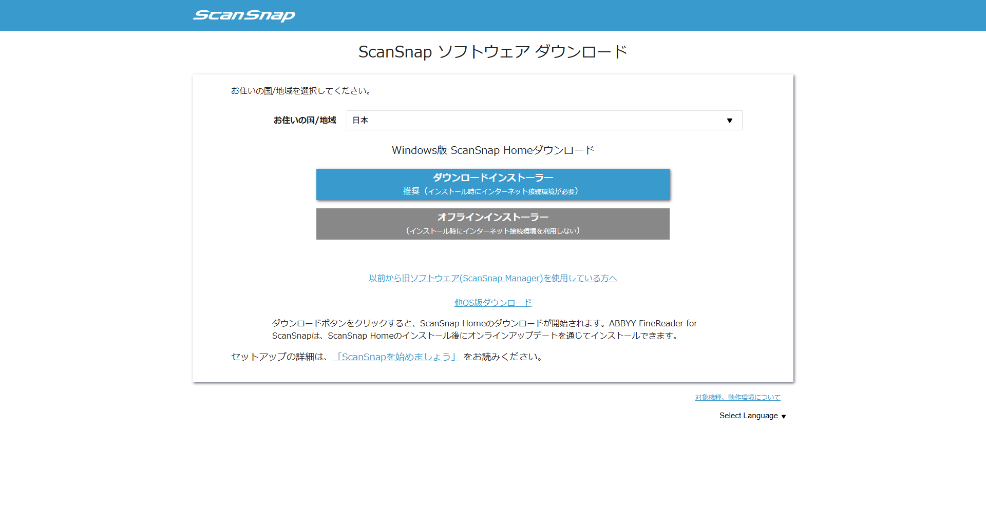【2】「ScanSnap」のページからドライバをインストールする場合