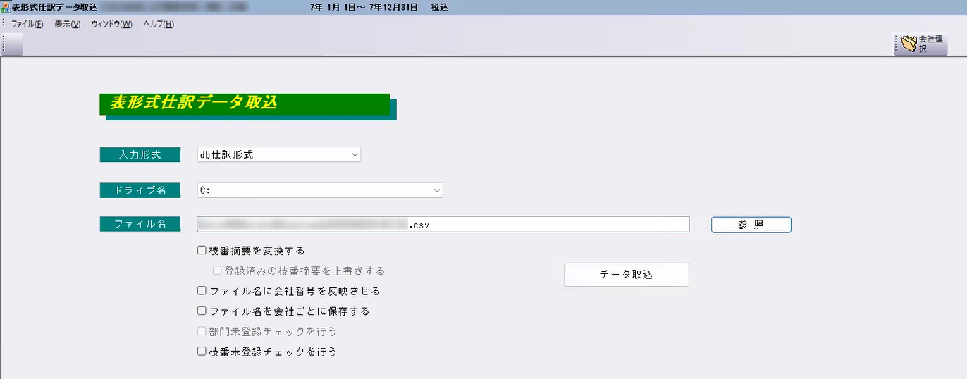 (2)「処理を行う会社を選択してください」と表示されていることを確認し、取り込みを行う会社を選択します。