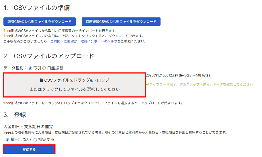 「2.CSVファイルのアップロード」でファイルを取り込みます。