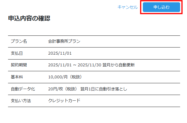 次画面で対象プランや料金を確認のうえ、「申し込む」をクリックすると有料登録が完了します。