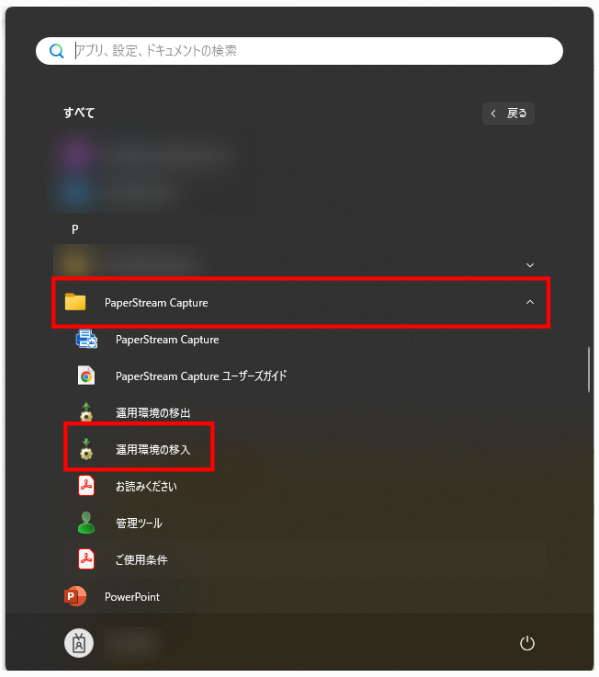 スタートメニューから[PaperStream Capture] – [運用環境の移入]を選択します。