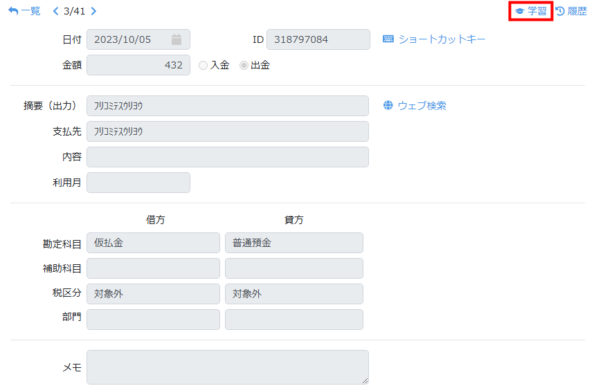 出力(ダウンロード)済のデータは、編集できませんが「学習」はクリックできます。