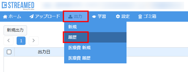 (1)「出力」>「履歴」をクリックして、出力履歴画面を開きます。