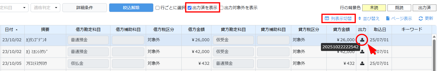 出力(ダウンロード)済のデータは、仕訳一覧画面で「出力済を表示」にチェックをすると確認できます。
