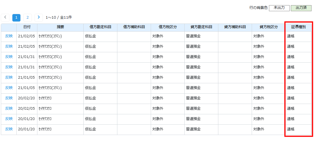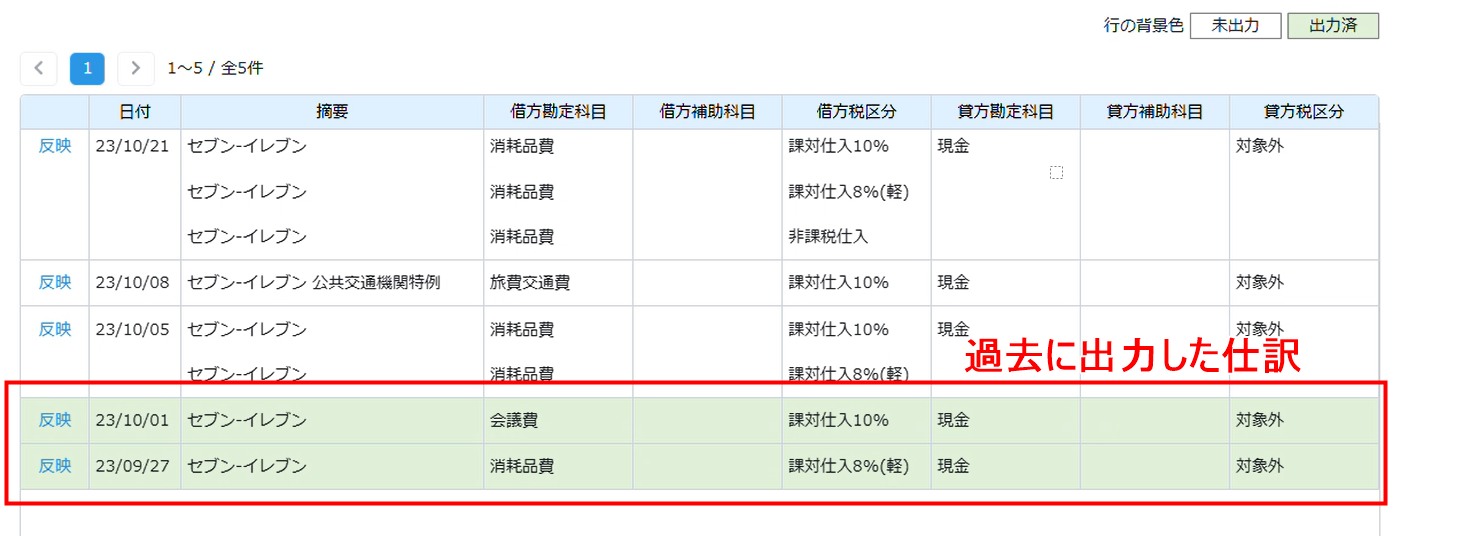 過去仕訳の検索画面において、会計ソフトへ「出力済み」の仕訳が、緑色の背景で表示されるようになりました。